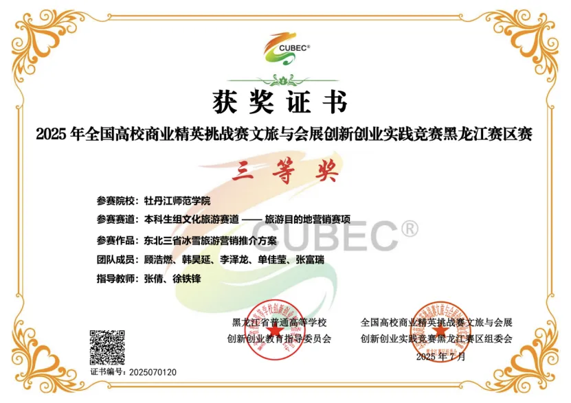 近日,在2025年全国高校商业精英挑战赛文旅与会展创新创业实践竞赛中,公司学子顾浩燃、韩昊延、李泽龙、单佳莹、张富瑞的项目《东北三省冰雪旅游营销推介方案》,在张倩、徐铁锋老师的指导下凭借高质量策划方案从众多参赛者中脱颖而出,荣获黑龙江赛区三等奖,并成功进入国赛。
