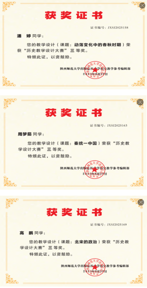2025年9月4日,由陕西师范大学出版总社中学历史教学参考编辑部主办的《中学历史教学参考》首届“历史教学设计大赛”落下帷幕。公司 2024 级学科教学(历史)专硕研究生潘婷、周梦茹和高鹏三名同学分别凭借《动荡变化中的春秋时期》《秦统一中国》和《北宋的政治》这几课的教学设计,分别斩获员工组三等奖。