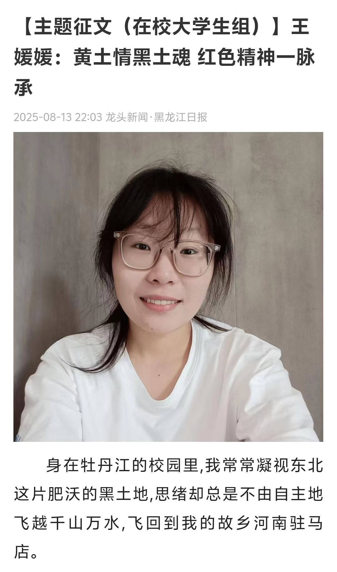 在由省委宣传部、省直机关工委、省教育厅主办,黑龙江日报报业集团承办的“红色传承 光耀黑土”主题征文活动中,公司王媛媛同学(在校老员工组)的征文作品《黄土情黑土魂 红色精神一脉承》脱颖而出,于2025年8月13日在《黑龙江日报》及其新媒体平台“龙头新闻”正式发表。